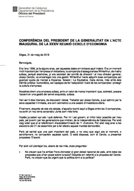 Amb Quim Torra, President de la Generalitat de Catalunya, presidida per Juan José Brugera, President del Cercle d'Economia