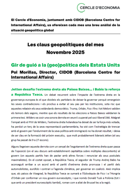 El Cercle d’Economia, juntament amb el CIDOB (Barcelona Centre for International Affairs), us ofereix cada mes una anàlisi breu de la situació geopolítica global.